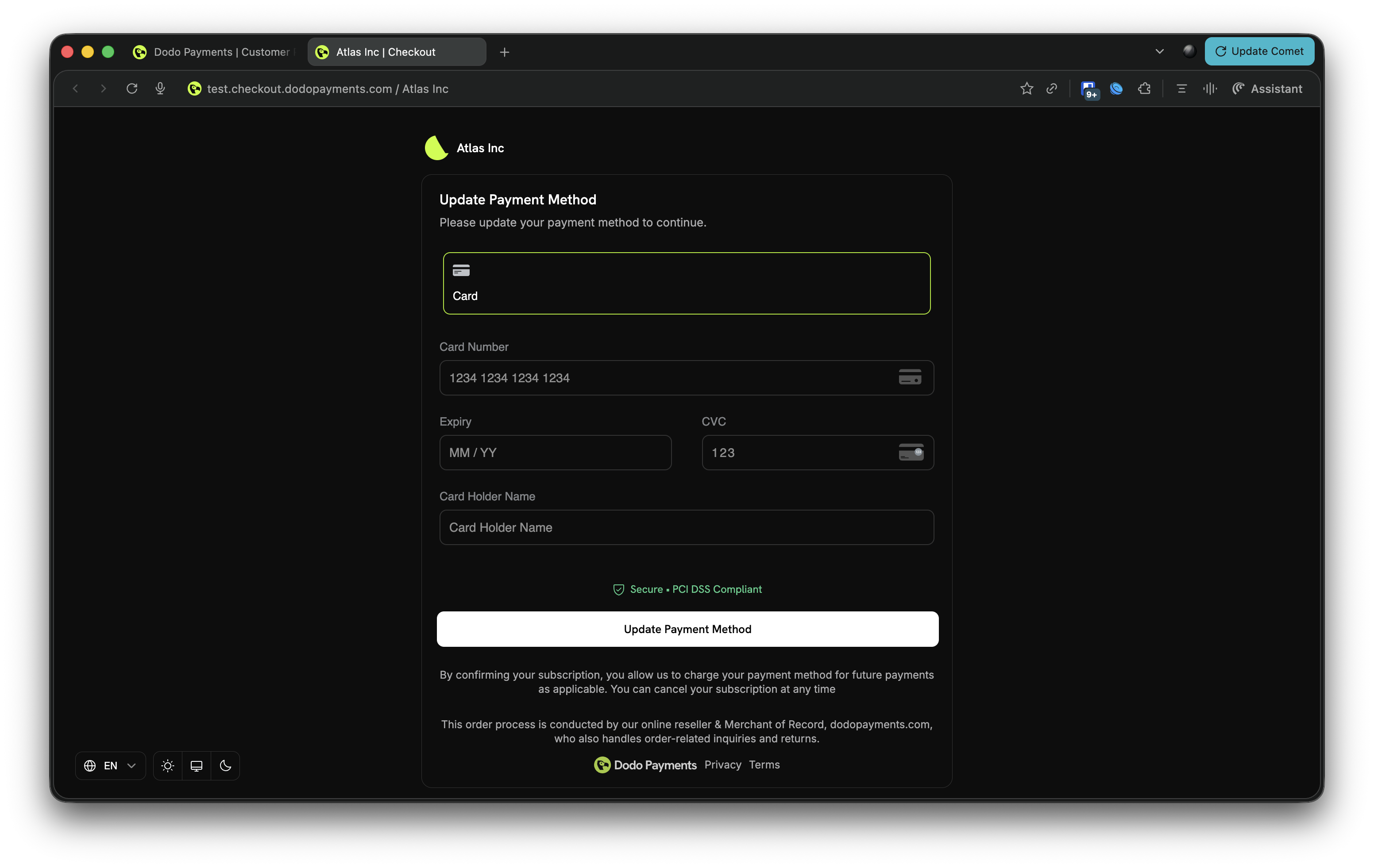 - Subscription on hold: If a subscription is on hold, customers must update their payment method through the portal to clear dues and reactivate the subscription. The update process will automatically charge for remaining dues.